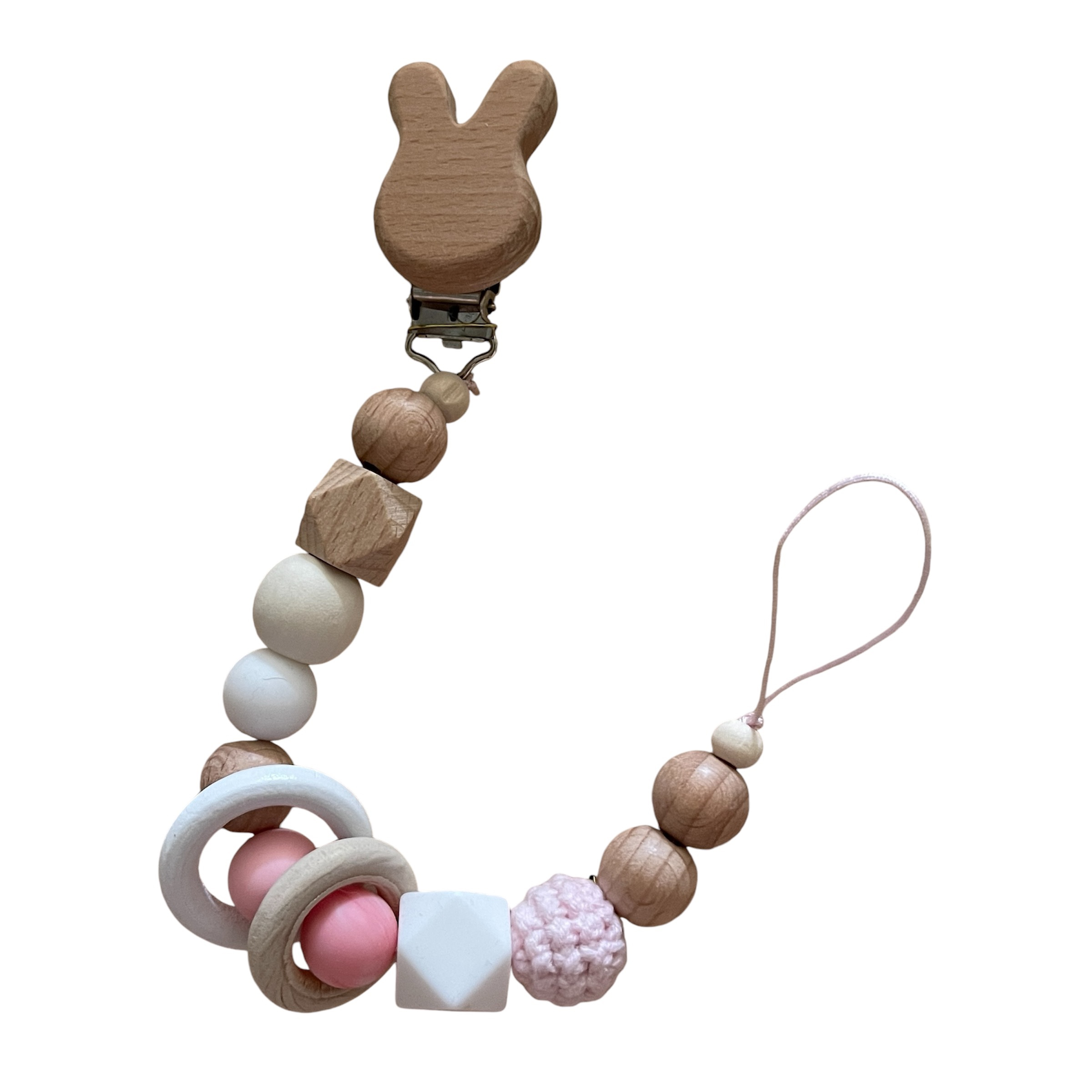 بند پستانک با سری خرسی از جنس چوب راش و مهره های به کار رفته از جنس سیلیکون و چوب روس میباشد. فاقد مواد سمی و دارای بسته بندی شکیل که مناسب هدیه دادن میباشد.