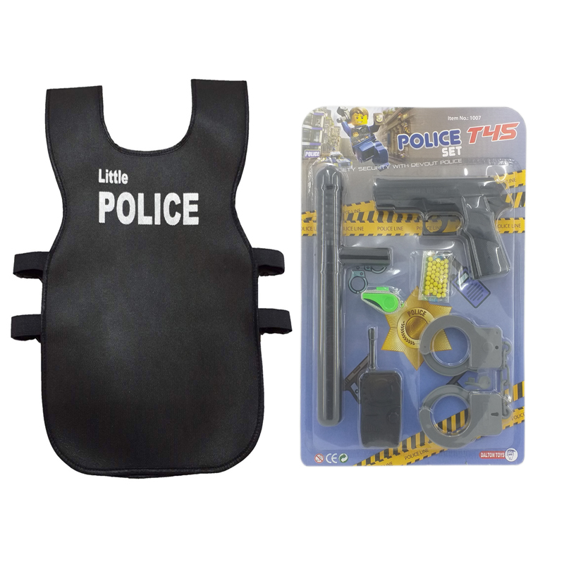 این مجموعه شامل 8 قلم کالا از جمله جلیقه پلیس، باتوم، تفنگ، ساچمه تفنگ، سوت، ماکت بیسیم، دستبند و کلید بوده و مناسب کودکان بالای 3 سال جهت آشنایی کودک با شغل پلیس می باشد .