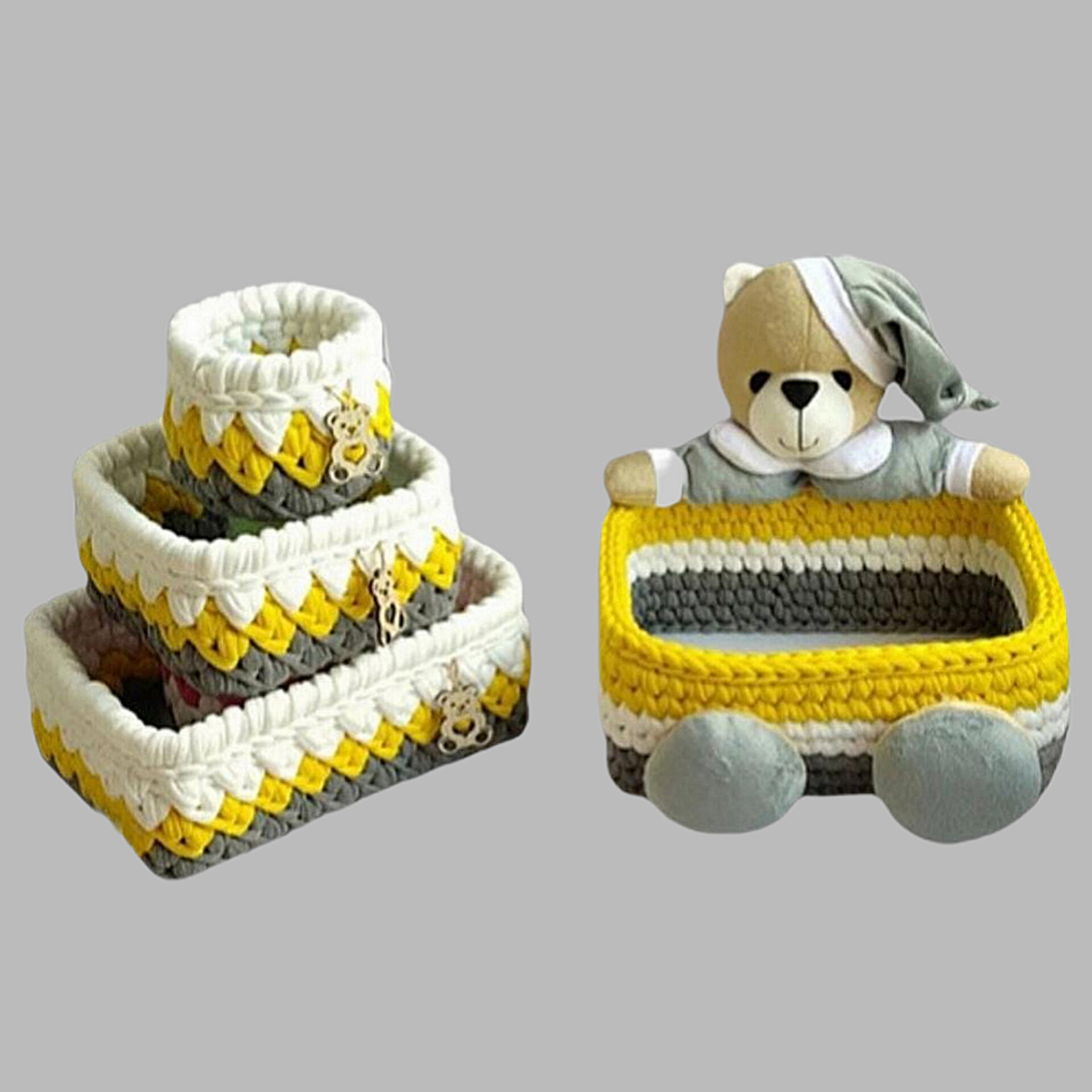 سبد تریکو طرح گندمی خرسی و بصورت دایره و مستطیل و مربع میباشد. مناسب میز آرایش و لوازم تحریر دانش آموزان سیسمونی نوزاد و اتاق کودک در ابعاد مستطیل به ضلع 25 و15و دایره به قطر 20 و مربع به ضلع 15 سانتیمتری هستند.با قابلیت شستشو با شامپو و اسفنج در رنگبندی مختلف میباشد