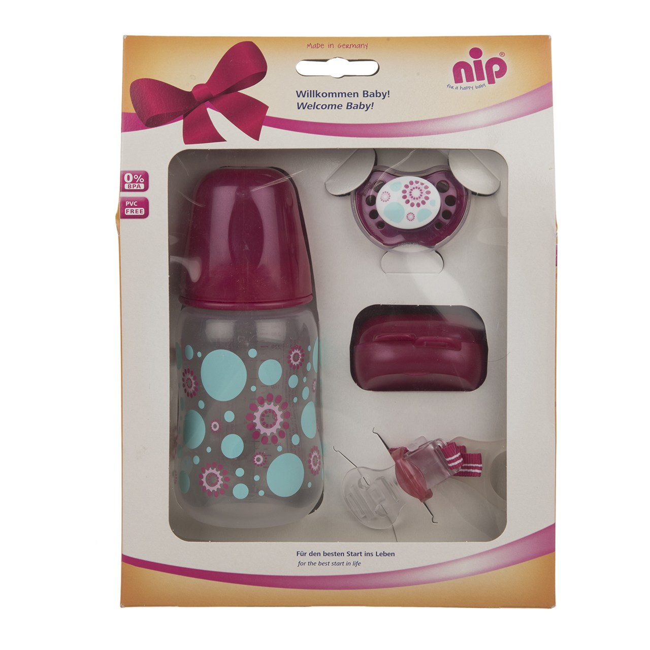 ست نوزادی برند آلمانی «نیپ»، مجموعه‌ای 4 تکه از لوازم ضروری و موردنیاز نوزاد شماست. این مجموعه شامل شیشه‌شیر، پستانک، بند پستانک و یک قاب محافظ است. از جمله ویژگی‌های این محصول می‌توان به فاقد BPA بودن تمامی اجزا، وجود سوپاپ در سرشیشه، طراحی گرد سرشیشه و وجود منفذ در بدنه‌ی پستانک اشاره کرد. در تولید این مجموعه سعی شده علاوه بر کیفیت، همه‌ی تکه‌ها از ظاهر زیبا و رنگی شاد برخوردار باشند.سوپاپ تعبیه‌شده در سرشیشه‌، از نفخ نوزاد جلوگیری می‌کند. سری این شیشه‌شیر کاملا گرد طراحی شده تا نوزاد به‌خوبی با آن ارتباط برقرار کند. پستانک با سری سیلیکونی ارتودنسی، تکه‌ی دیگر این مجموعه است که بدنه‌ای پلاستیکی دارد. روی این بدنه، منفذ‌های کوچکی تعبیه شده است تا هوا روی پوست صورت نوزاد جریان پیدا کند. همچنین این پستانک را می‌توانید به وسیله‌ی بند پستانک پارچه‌ای به لباس کوچولوی خود متصل کنید. با وجود این بند، دیگر نگران گم‌شدن پستانک نخواهید بود. همچنین برای محافظت از پستانک در برابر هرگونه آلودگی، قاب محافظی ارائه شده که خیلی به کارتان می‌آید.در آخر با توجه به مشخصه‌های این محصول در کنار قیمتی معقول، می‌بینیم که این ست، مجموعه‌ای کامل برای نوزاد به شمار می‌آید و برای هدیه بسیار مناسب است.