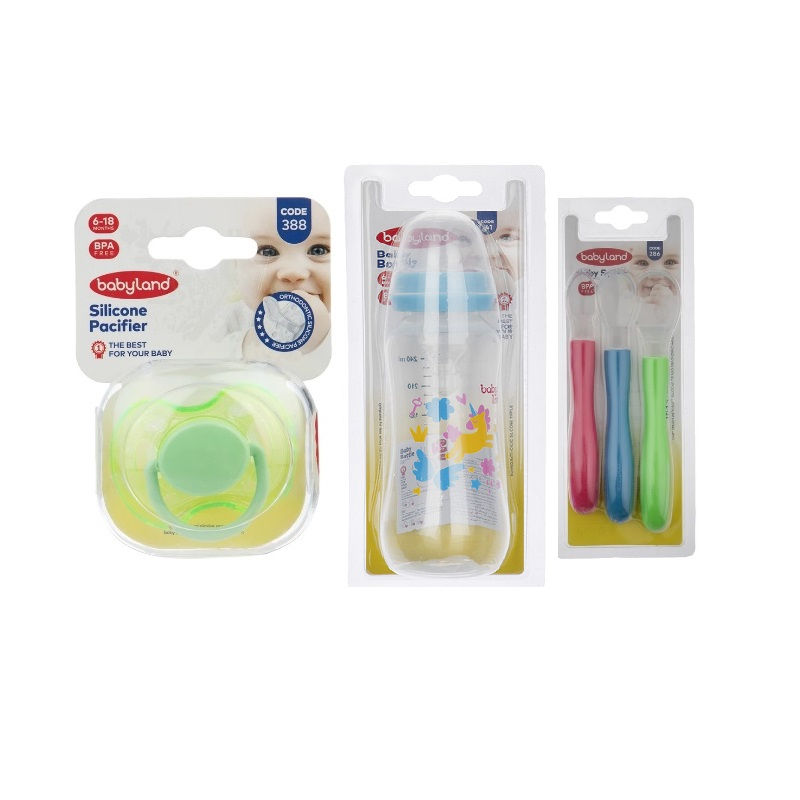 شیشه شیر بیبی لند مدل 241 حجم 200 میلی لیتر به همراه قاشق بیبی لند مدل 286 به همراه پستونک ارتودنسی بیبی لند مدل 388 مجموعه 3 عددی